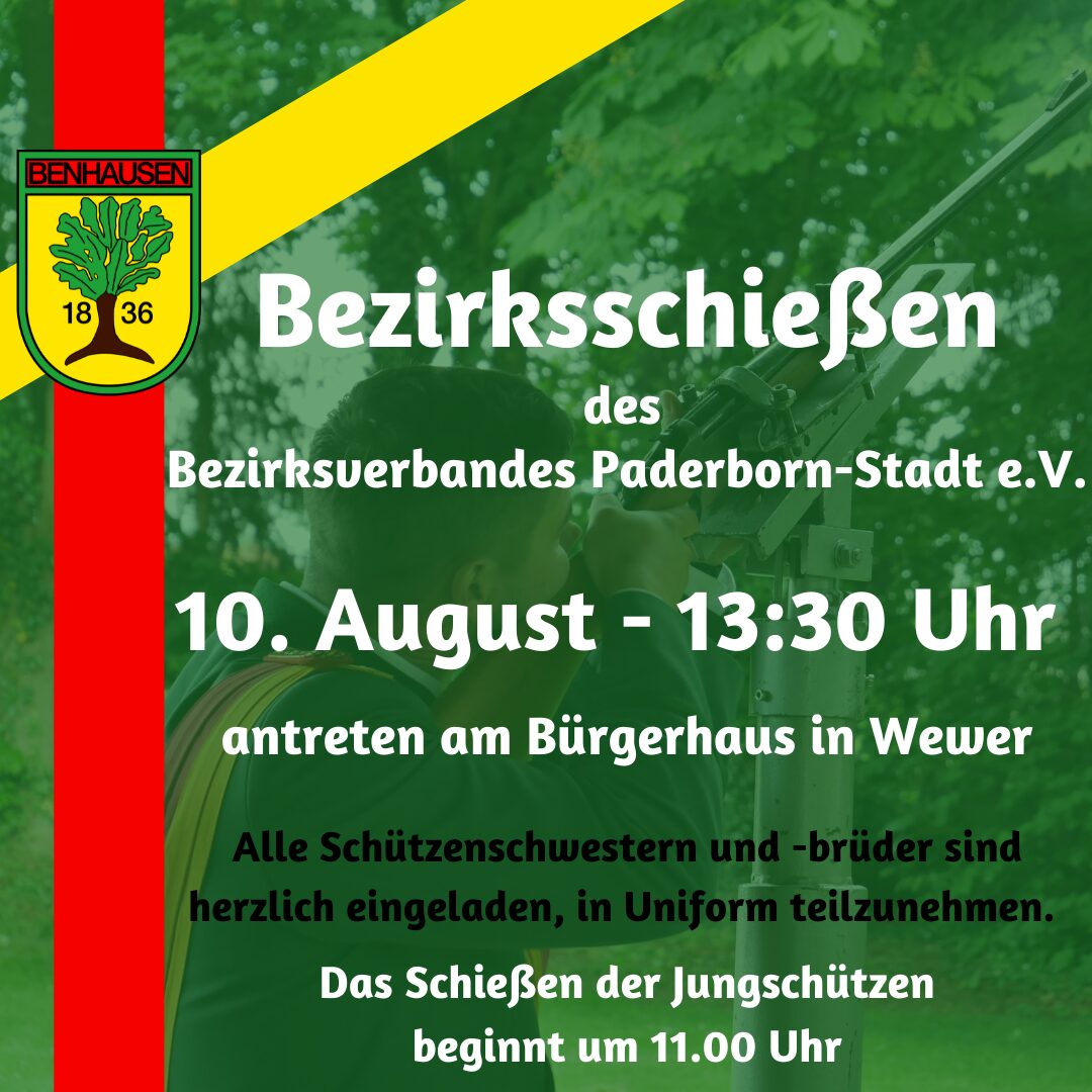 Der Tag beginnt um 11:00 Uhr mit dem Schießen der Jungschützen. Um 14:00 Uhr treten die Schützenvereine des Bezirksverbandes Paderborn-Stadt am Bürgerhaus in Wewer an. Die Schützenschwestern und -brüder aus Benhausen treffen sich ab 13:30 Uhr vor Ort. Die Anreise wird eigenständig organisiert.