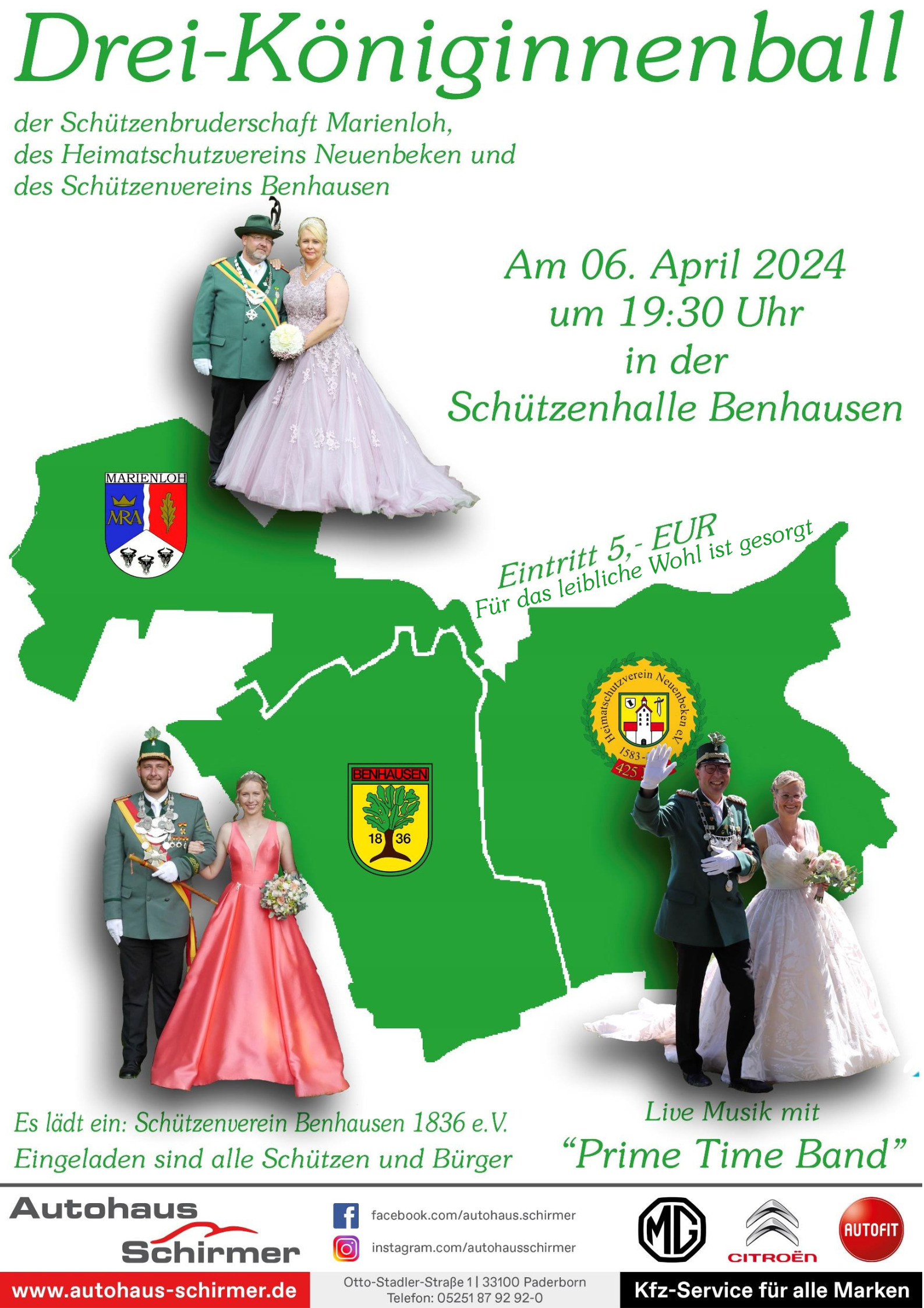 Am 06. April 2024 findet der Königinnenball zu Ehren der Königinnen der Schützenbruderschaft Marienloh, des Heimatschutzvereins Neuenbeken und des Schützenvereins Benhausen in der Schützenhalle Benhausen statt. Die Veranstaltung beginnt um 19:30 Uhr.