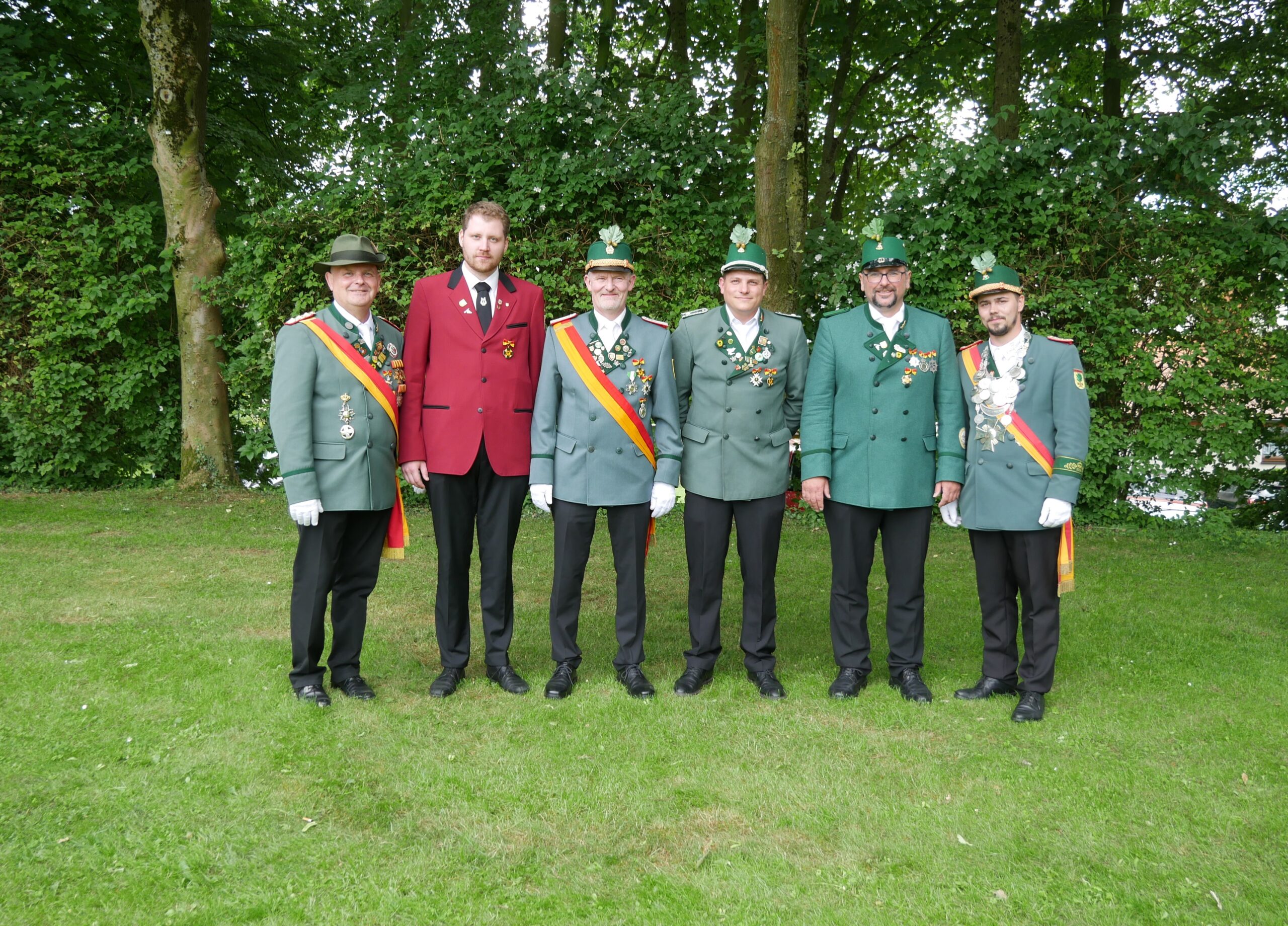 Peter Rüsing, Andreas Schirmer und Meinolf Kröger mit Oberst Norbert Glasmeyer, König André Noll und dem Bezirksbundesmeisters Paderborn-Stadt Olaf Pippert.